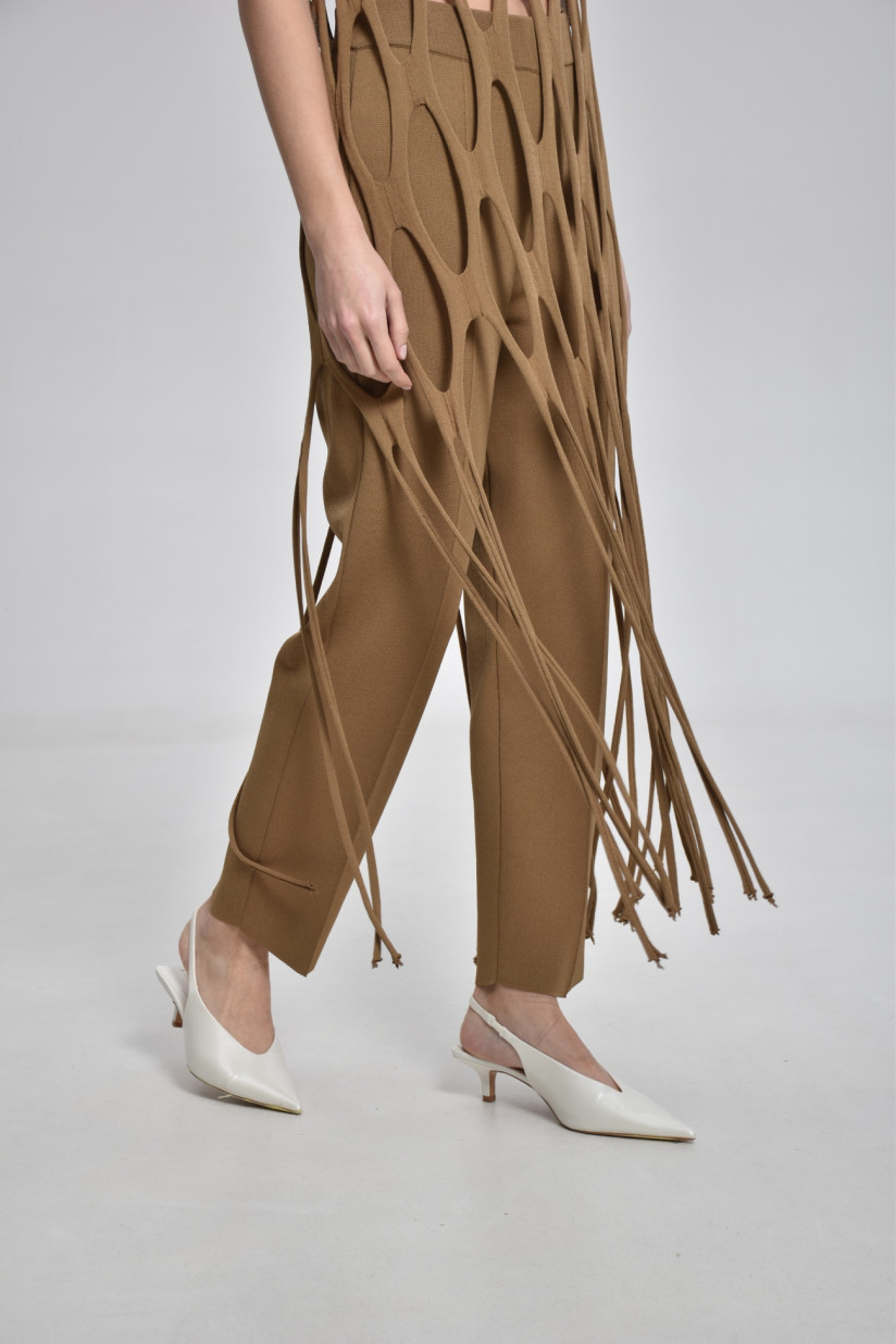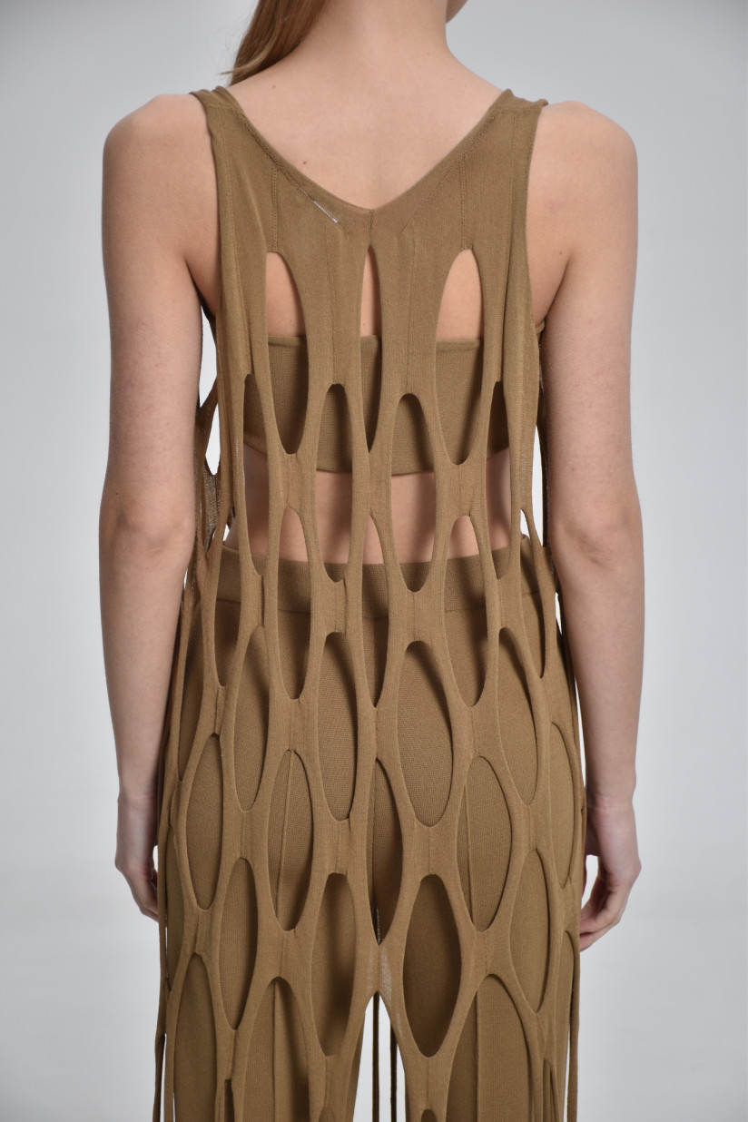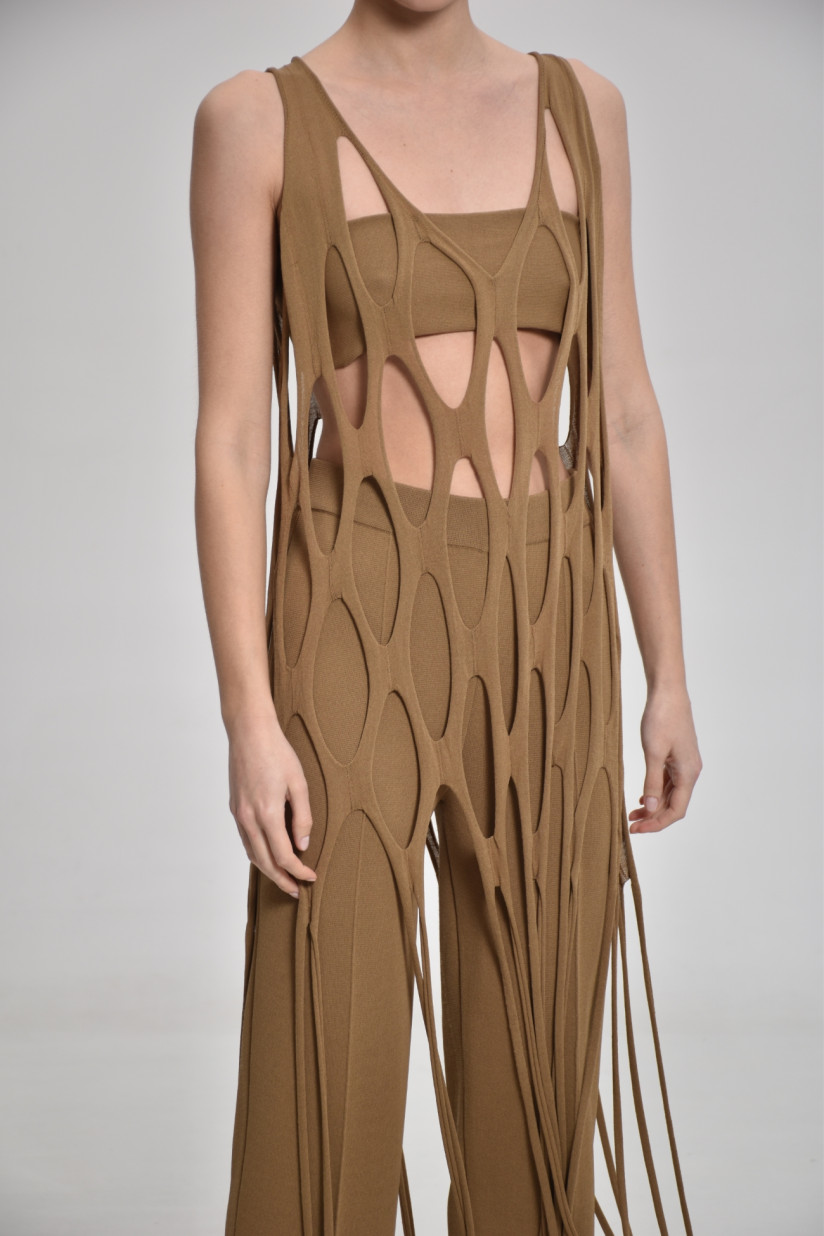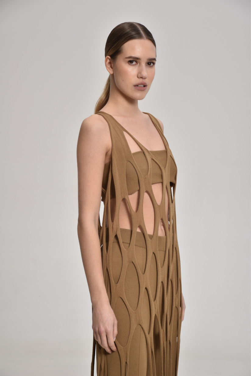 Туніка-накидка без рукавів з глибоким V-подібним вирізом, що підкреслює лінію декольте, виготовлена з віскози. Оригінальна, крупна сітчаста текстура та витончені китиці, що спадають від середини стегна до середини гомілки, створюють граціозний рух у такт кожному кроку, надаючи динаміки силуету.