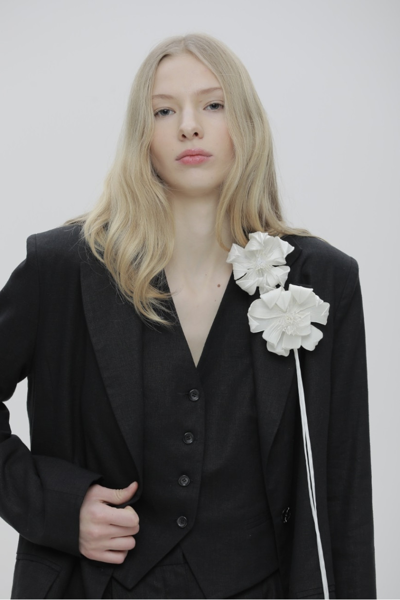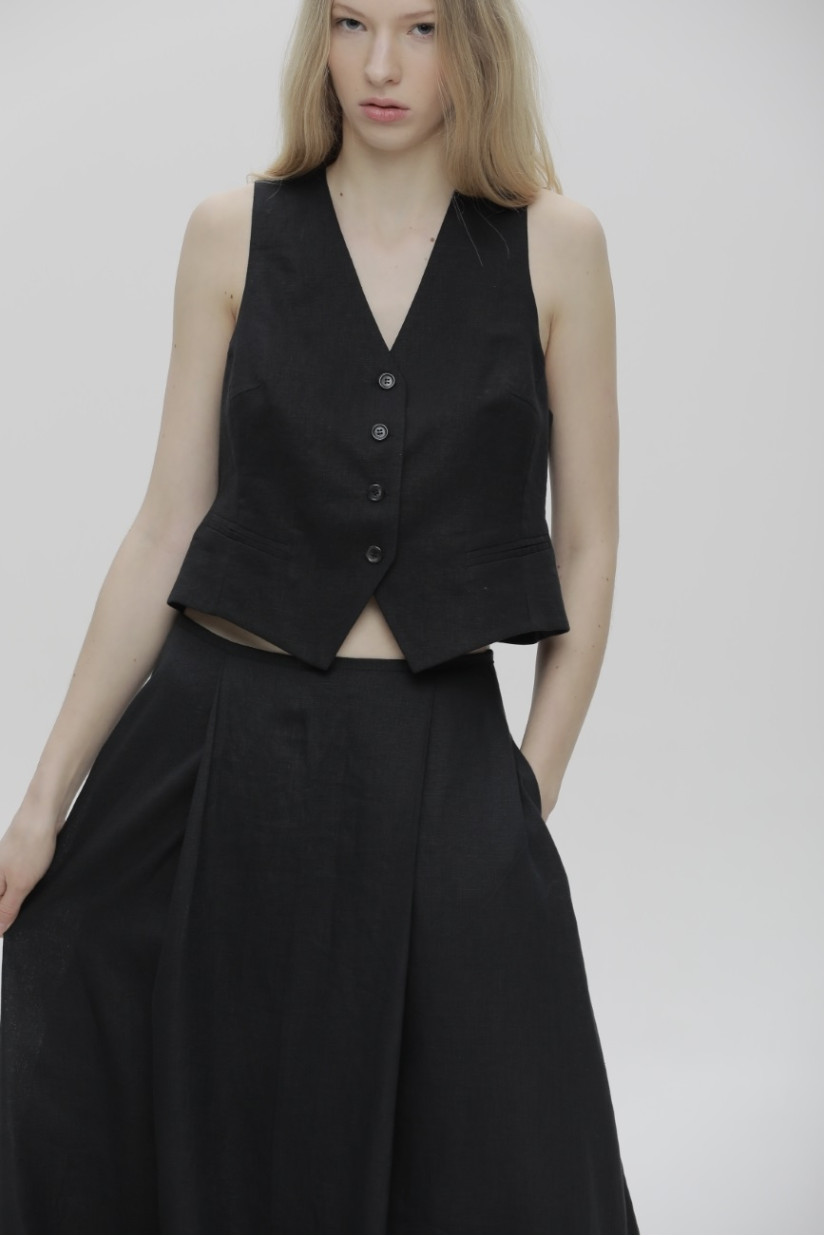 Лляний жилет на підкладці представлений в чорному та білому кольоах. Застібка на ґудзиках. Поєднуйте його зі штанами, спідницею та піджаком з тієї ж капсули.