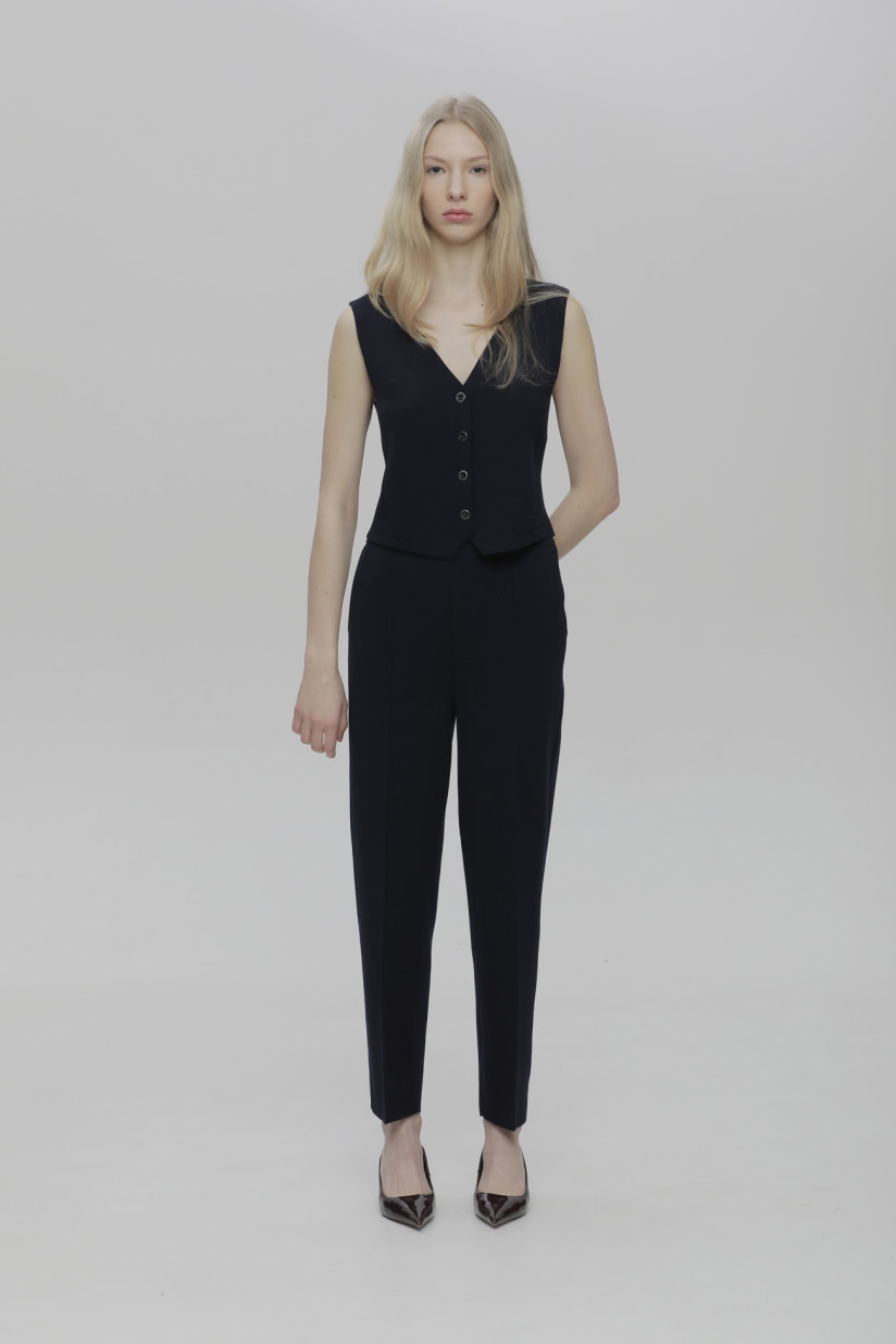 Трикотажна жилетка з віскози. Застібка на ґудзиках. Жилет представлений в базових кольорах колекції. Поєднуйте його зі штанами з тієї ж колекції, або з джинсами для щоденного образу. Він легко надівається на сорочки і джемпери.
